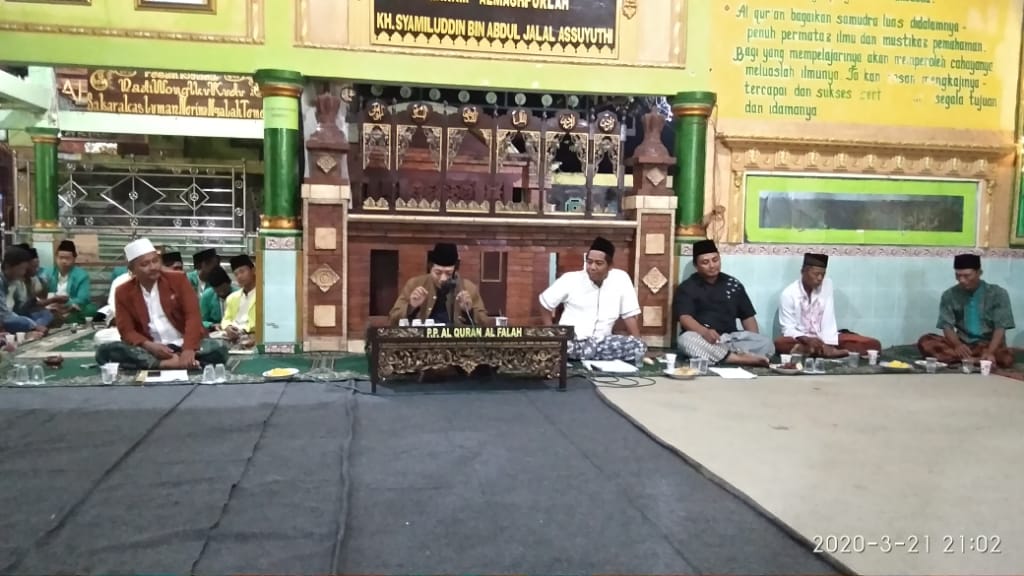 PP. Alqur’an Alfalah menggelar doa bersama yang berlangsung di pendopo pondok, Sabtu (21/3/2020). Doa bersama kali ini bertujuan memohon keselamatan bagi seluruh santri, jama’ah dang bangsa Indonesia ini terhindar dari wabah virus Covid19.